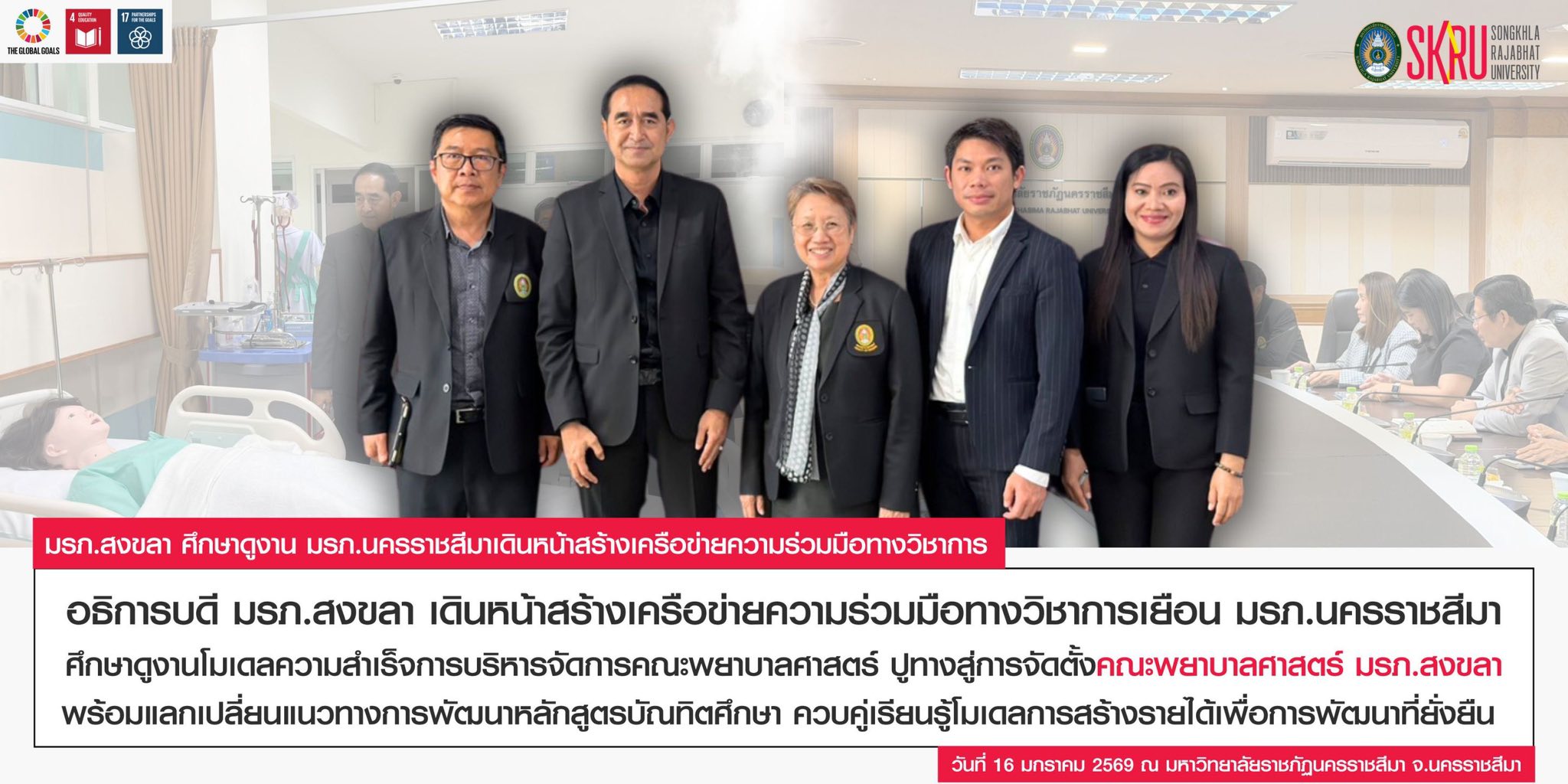 อธิการบดี มรภ.สงขลา เดินหน้าสร้างเครือข่ายความร่วมมือทางวิชาการ เดินทางเยือน มรภ.นครราชสีมา ศึกษาดูงานโมเดลความสำเร็จการบริหารจัดการคณะพยาบาลศาสตร์ ปูทางสู่การจัดตั้งคณะพยาบาลศาสตร์ มรภ.สงขลา พร้อมแลกเปลี่ยนแนวทางการพัฒนาหลักสูตรบัณทิตศึกษา ควบคู่เรียนรู้โมเดลการสร้างรายได้เพื่อการพัฒนาที่ยั่งยืน