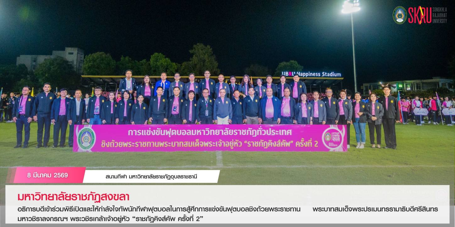 เมื่อวันที่ 8 มีนาคม 2569 ผศ.พิเชษฐ์ จันทวี อธิการบดีมหาวิทยาลัยราชภัฏสงขลา (มรภ.สงขลา) เดินทางเข้าร่วมพิธีเปิดและให้กำลังใจทีมนักกีฬาฟุตบอล มรภ.สงขลา ก่อนลงสนามแข่งขันฟุตบอลมหาวิทยาลัยราชภัฏทั่วประเทศ ชิงถ้วยพระราชทานพระบาทสมเด็จพระเจ้าอยู่หัว “ราชภัฏคิงส์คัพ ครั้งที่ 2” ซึ่งกำหนดจัดขึ้นระหว่างวันที่ 8-16 มีนาคม 2569 ณ มหาวิทยาลัยราชภัฏอุบลราชธานี (มรภ.อุบลราชธานี)