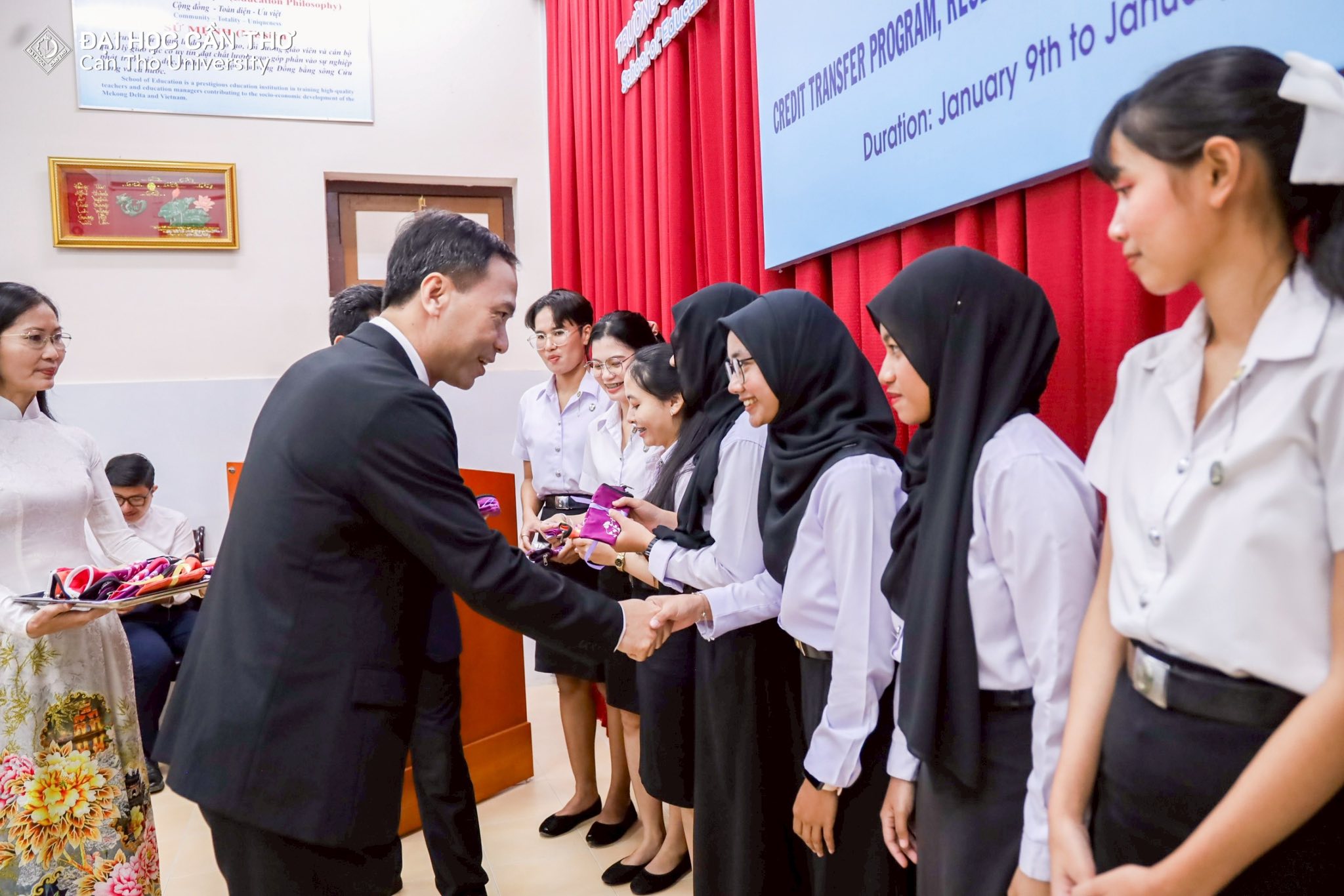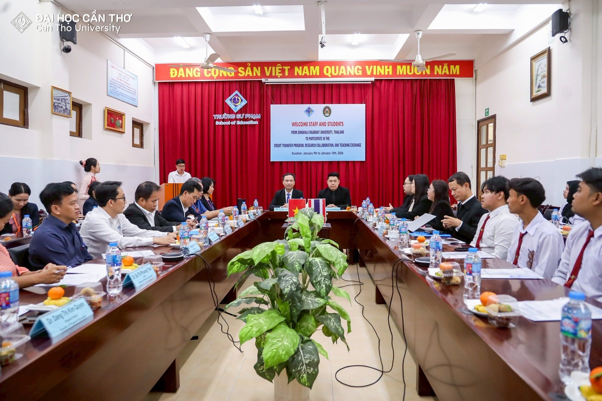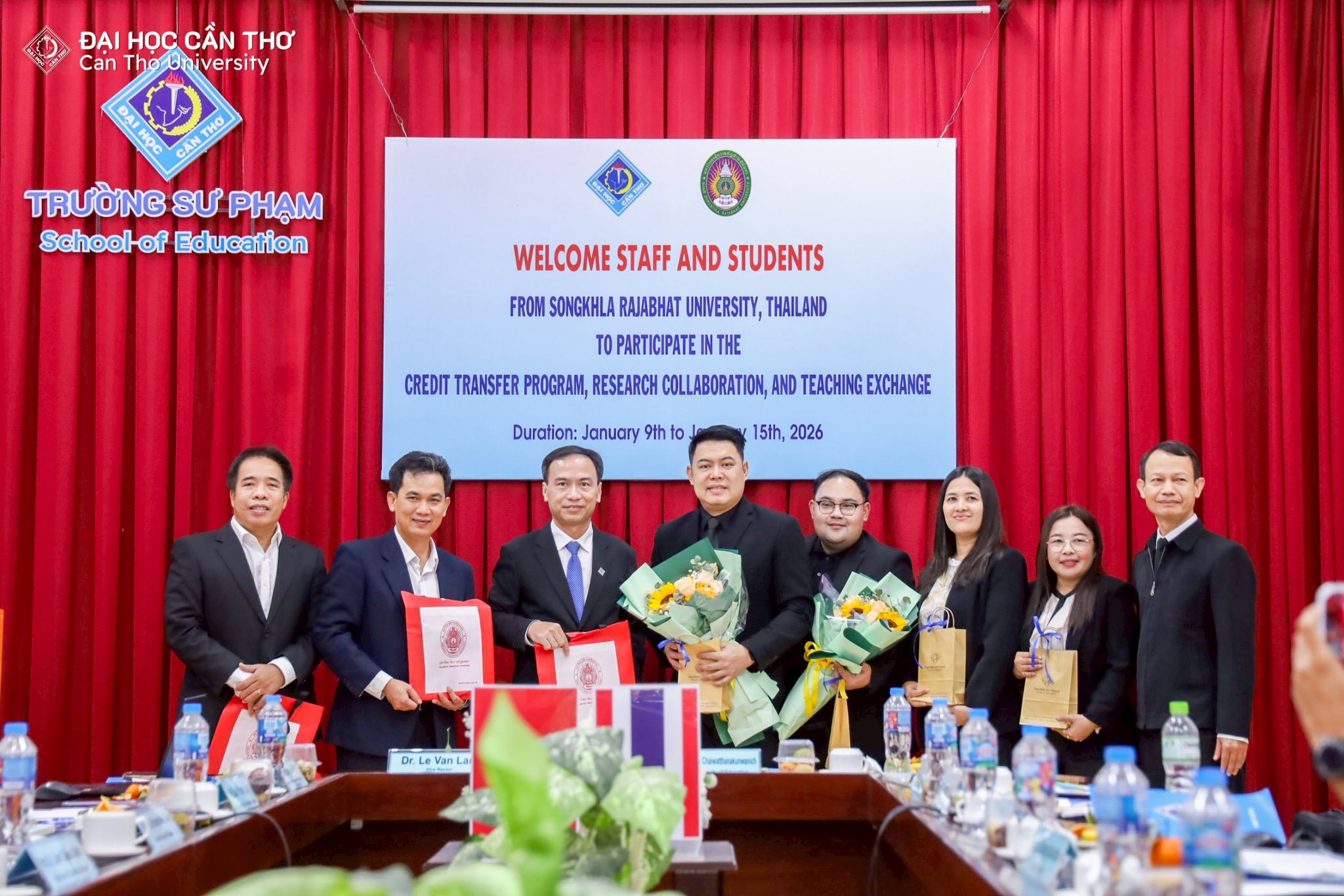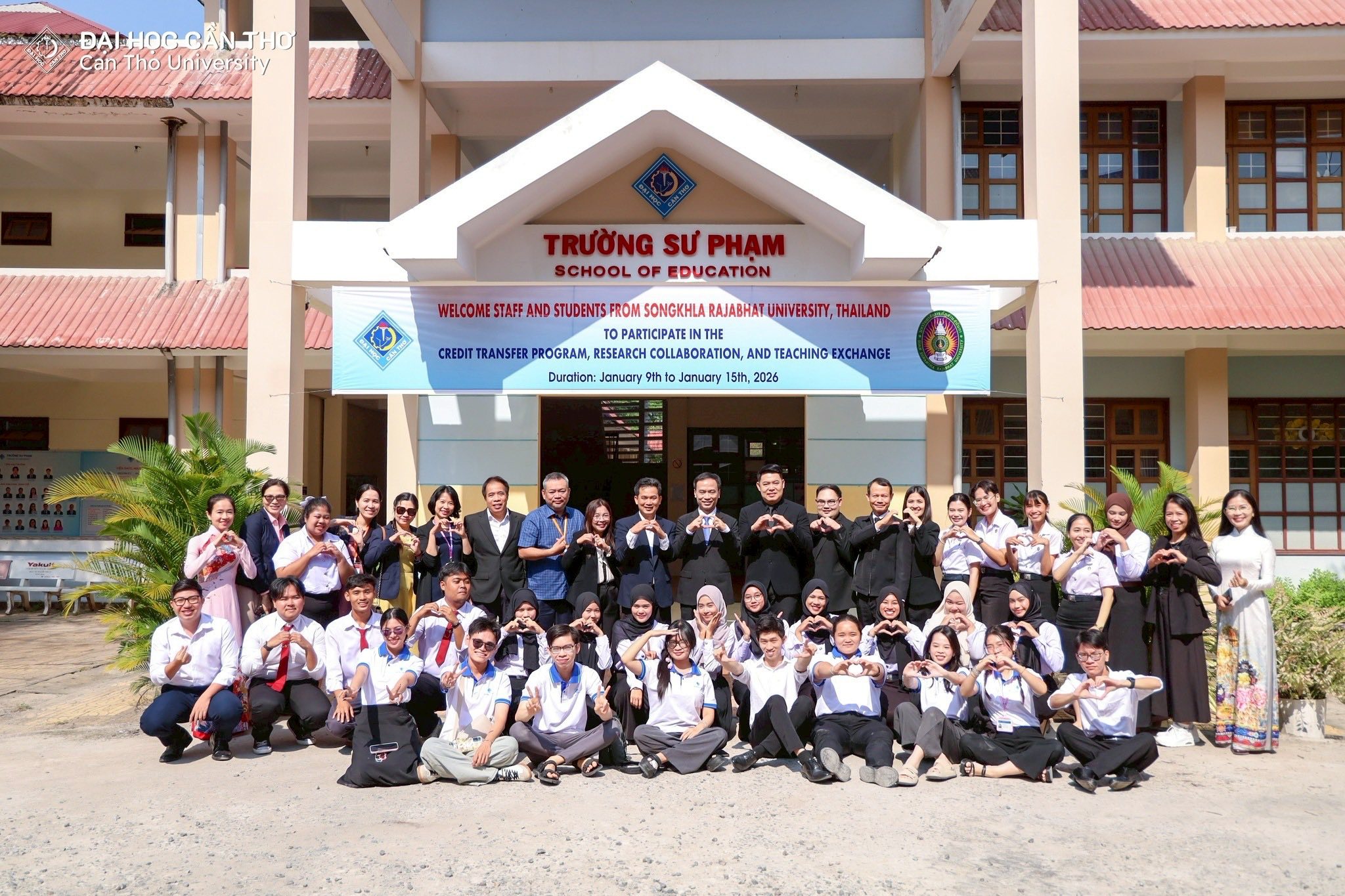 คณะครุศาสตร์ มหาวิทยาลัยราชภัฏสงขลา (มรภ.สงขลา) จัดโครงการส่งเสริมความร่วมมือการแลกเปลี่ยนการเรียนรู้ด้านครุศาสตร์ ณ Can Tho University สาธารณรัฐสังคมนิยมเวียดนาม ระหว่างวันที่ 9-15 มกราคม 2569 โดย ผศ.ดร.โสภณ ชัยวัฒนกุลวานิช คณบดีคณะครุศาสตร์ ได้นำคณาจารย์ผู้ควบคุมโครงการ อาจารย์ ดร.เอกพล ไพโรจน์ ผู้ช่วยคณบดี ผศ.ดร.จงกล บัวแก้ว ผศ.ดร.ณรงค์ กาญจนะ และ ผศ.ดร.พนัชกร พิทธิยะกุล อาจารย์คณะครุศาสตร์ พร้อมตัวแทนนักศึกษาคณะครุศาสตร์ที่ผ่านการคัดเลือกเข้าร่วมโครงการ จำนวน 18 คน เข้าพบคณะผู้บริหาร School of Education, Can Tho University นำโดย Dr. Le Van Lam, Vice Rector of Can Tho University Assoc. Prof. Huynh Anh Huy คณบดี พร้อมด้วย Assoc. Prof. Tran Van Minh Prof. Lam Quoc Anh และ Dr. Le Van Nhuong รองคณบดี ซึ่งได้ให้การต้อนรับคณะผู้มาเยือนอย่างอบอุ่น