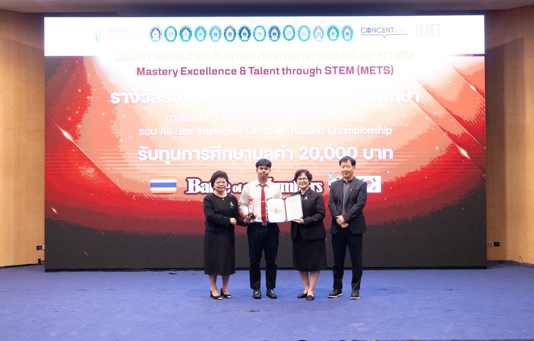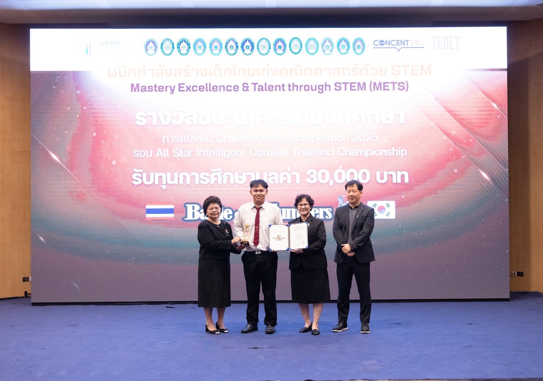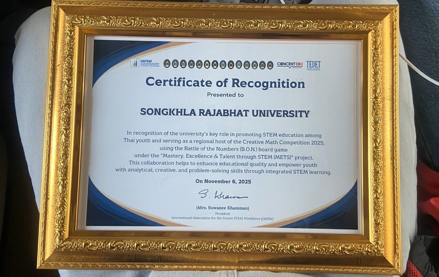มรภ.สงขลา สุดปลื้ม นักศึกษาสาขาวิชาคณิตศาสตร์ คณะครุฯ คว้ารางวัลชนะเลิศและรองชนะเลิศอันดับ 1 เวที “ผนึกกำลังสร้างเด็กไทยเก่งคณิตศาสตร์ด้วย STEM” ผ่านการแข่งขัน Creative Math Competition 2025 - Battle of the Numbers All Star Intelligent Contest Thailand Championship ได้รับสิทธิ์เป็นตัวแทนประเทศไทยแข่งขันต่อในเวทีระดับนานาชาติกับประเทศเกาหลีใต้ พร้อมรับประกาศนียบัตรเชิดชูเกียรติในฐานะสถาบันที่มีส่วนร่วมสำคัญในการขับเคลื่อนโครงการฯ