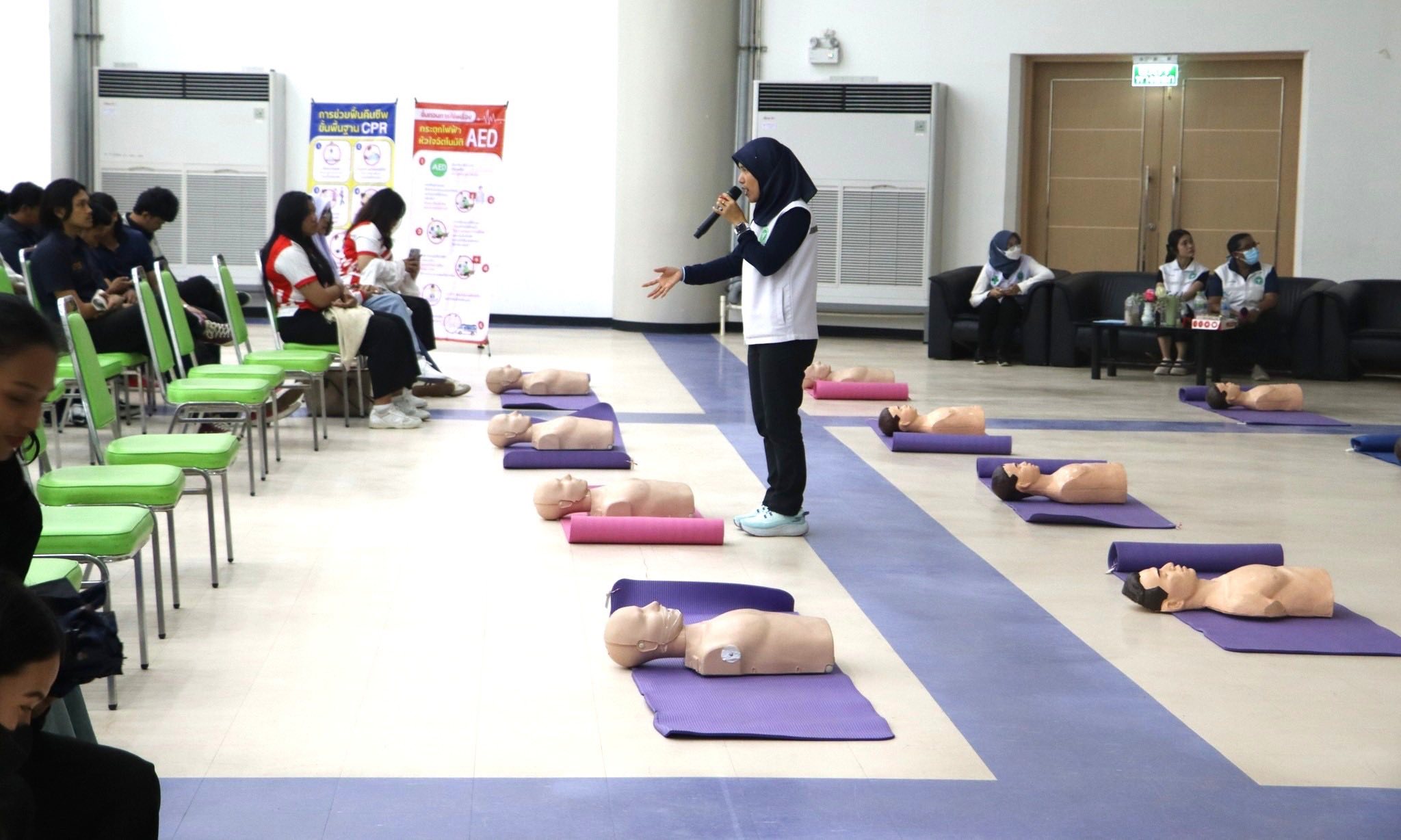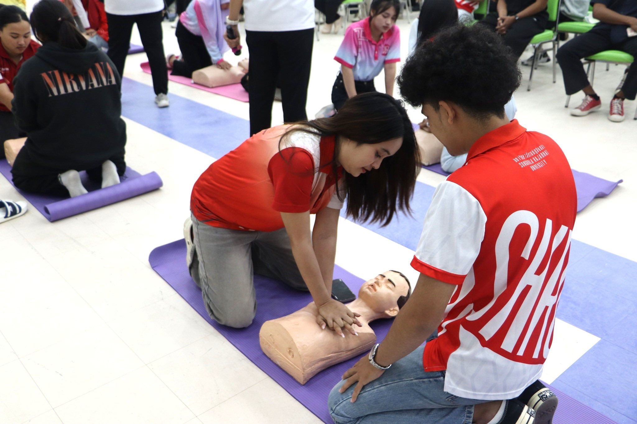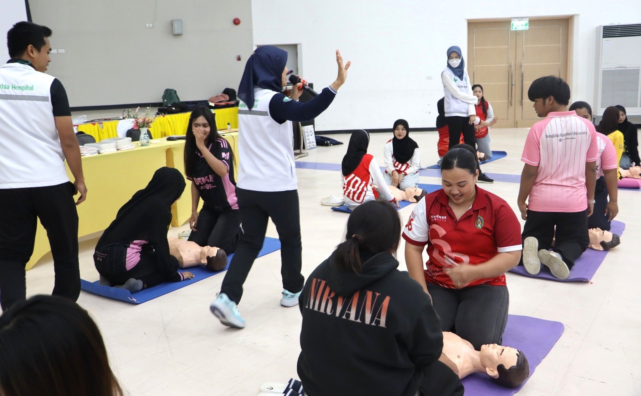 กองพัฒนานักศึกษา มรภ.สงขลา จัดอบรมการช่วยฟื้นคืนชีพขั้นพื้นฐานและการใช้เครื่องกระตุกหัวใจไฟฟ้าชนิดอัตโนมัติ เทียบเชิญทีมวิทยากรโรงพยาบาลสงขลา ถ่ายทอดทักษะด้านการปฐมพยาบาลและช่วยเหลือชีวิตผู้ที่มีภาวะหยุดหายใจ