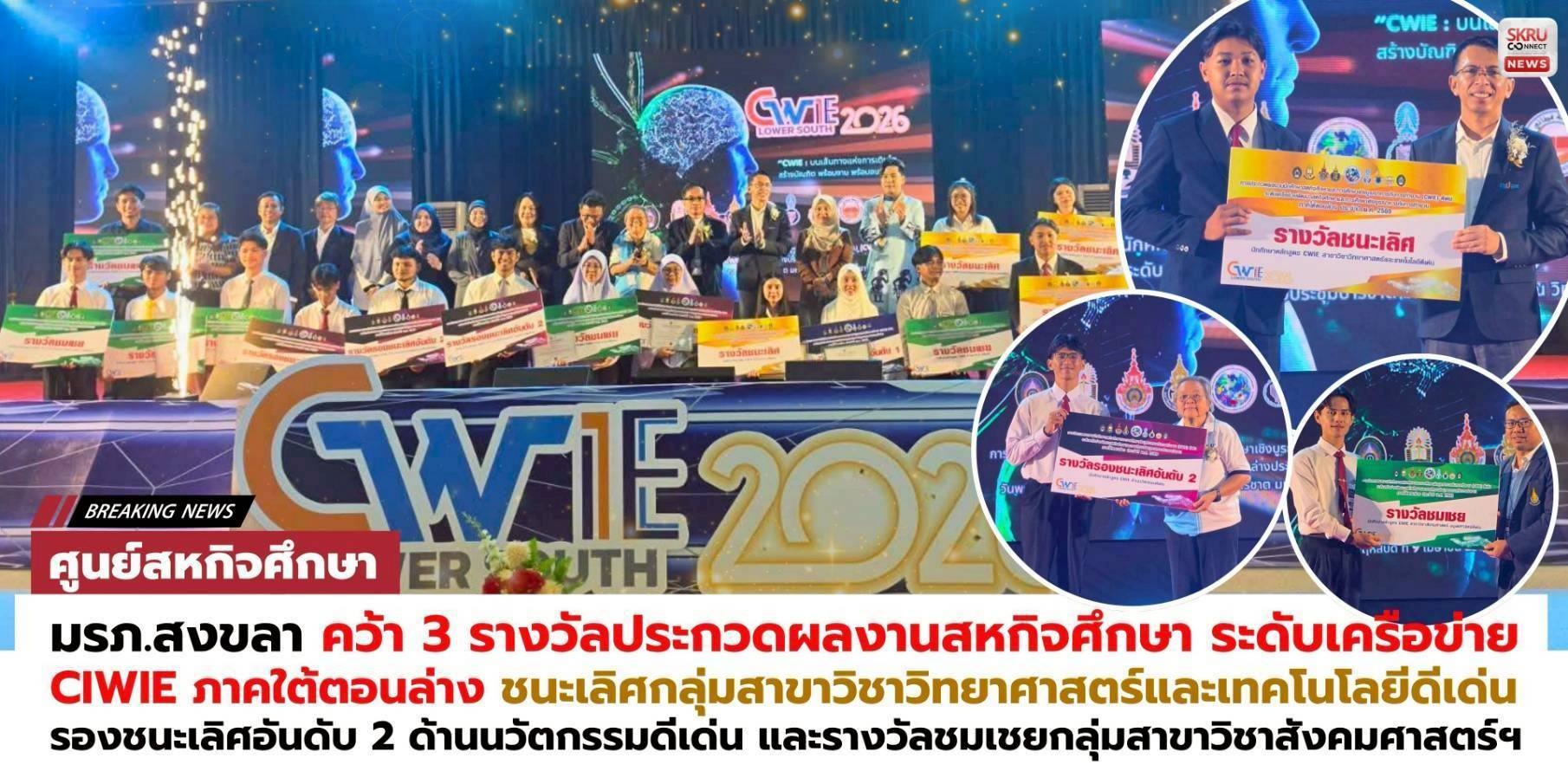 นักศึกษาสหกิจศึกษา มรภ.สงขลา กวาด 3 รางวัลเวทีประกวดผลงานสหกิจศึกษา ระดับเครือข่าย CWIE ภาคใต้ตอนล่าง ที่ ม.ทักษิณ ชนะเลิศกลุ่มสาขาวิชาวิทยาศาสตร์และเทคโนโลยีดีเด่น จากผลงาน "ผลของปริมาณความเข้มแสงต่อประสิทธิภาพการเจริญเติบโตของไก่เนื้อเพศผู้" พร้อมคว้ารางวัลรองชนะเลิศอันดับ 2 ด้านนวัตกรรมดีเด่น และรางวัลชมเชยกลุ่มสาขาวิชาสังคมศาสตร์ มนุษยศาสตร์ดีเด่น