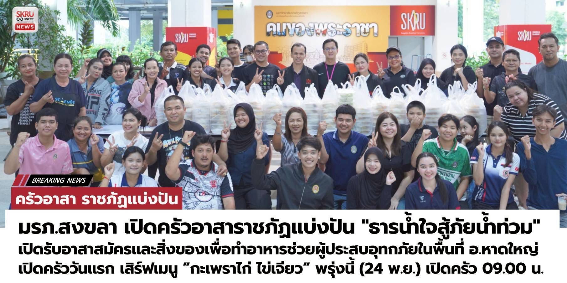 มรภ.สงขลา เปิดครัวอาสาราชภัฏแบ่งปัน "ธารน้ำใจสู้ภัยน้ำท่วม" เปิดรับอาสาสมัครและสิ่งของเพื่อทำอาหารช่วยผู้ประสบอุทกภัยในพื้นที่ อ.หาดใหญ่
