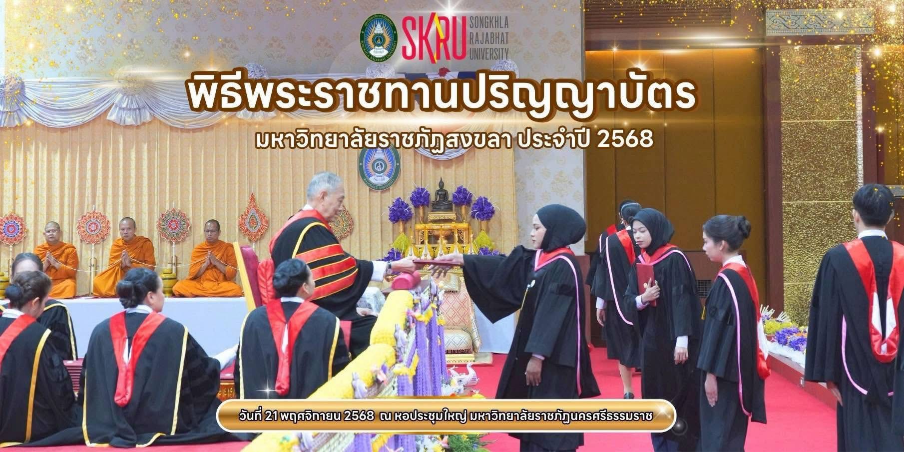 พระบาทสมเด็จพระเจ้าอยู่หัว ทรงพระกรุณาโปรดเกล้าโปรดกระหม่อมให้ พลอากาศเอก ชลิต พุกผาสุข องคมนตรี เป็นผู้แทนพระองค์ไปยังหอประชุมใหญ่ มหาวิทยาลัยราชภัฏนครศรีธรรมราช จังหวัดนครศรีธรรมราช ในพิธีพระราชทานปริญญาบัตรแก่ผู้สำเร็จการศึกษาจากมหาวิทยาลัยราชภัฏเขตภาคใต้ ประจำปีการศึกษา 2566 ระหว่างวันที่ 20 – 21 พฤศจิกายน 2568 โดยมีบัณฑิตมหาวิทยาลัยราชภัฏสงขลา เข้ารับพระราชทานปริญญาบัตรในวันที่ 21 พฤศจิกายน 2568 จำนวนทั้งสิ้น 950 คน แบ่งเป็นระดับบัณฑิตศึกษา จำนวน 928 คน ระดับมหาบัณฑิต จำนวน 22 คน   มหาวิทยาลัยราชภัฏสงขลา ได้ดำเนินงานโครงการส่งเสริมคุณภาพการศึกษาโรงเรียนตำรวจตระเวนชายแดน ตามพระราชดำริสมเด็จพระกนิษฐาธิราชเจ้า กรมสมเด็จพระเทพรัตนราชสุดาฯ สยามบรมราชกุมารี โดยเน้นการจัดอบรมเชิงปฏิบัติการ เพื่อพัฒนาครูโรงเรียนตำรวจตระเวนชายแดน สังกัดกองกำกับการตำรวจตระเวนชายแดนที่ 43 จำนวนทั้งหมด 15 โรงเรียน จาก 4 จังหวัด คือ จังหวัดสงขลา สตูล พัทลุง และตรัง เพื่อให้ครูผู้สอนสามารถเขียนแผนการจัดการเรียนรู้ที่สอดคล้องกับตัวชี้วัด ช่วยพัฒนาครูใหญ่ และครูวิชาการ  เพื่อจัดทำแผน และพัฒนาทักษะด้านการนิเทศในขั้นเรียนได้อย่างถูกต้อง อันจะส่งผลในการยกระดับคุณภาพการศึกษา เพื่อการพัฒนาอย่างยั่งยืนสอดคล้องกับบริบทของชุมชนท้องถิ่น